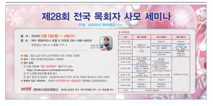 총회 농어촌부(부장 박재균 목사)에서 주관하는 제28회 전국 목회자 사모세미나가 2월 2일(월)부터 4일(수)까지 2박 3일간 전남 여수 유탑마리나 호텔 & 리조트에서 열린다.